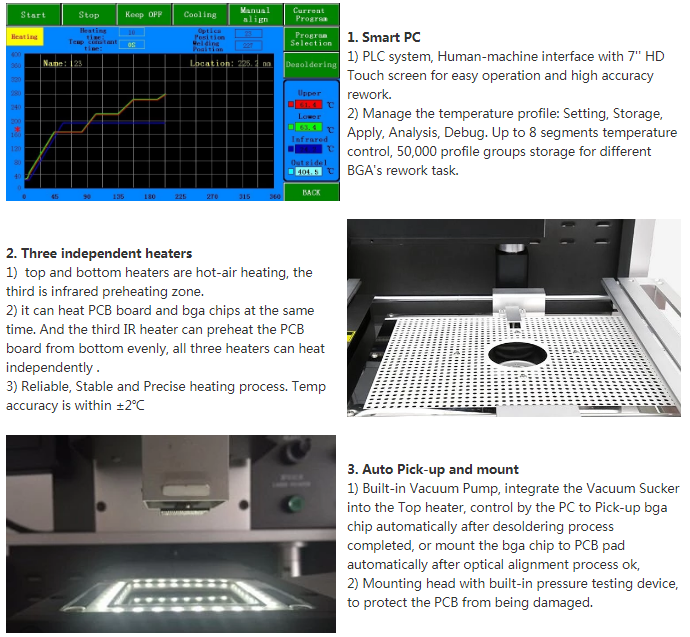 81 optisk notebook bga rework station 1. Produktintroduksjon Et kameradrevet justeringssystem gir feilfri nøyaktighet fra forhåndsjustering til komponentplassering. Precision Hot Air Technology sikrer at ønsket temperatur nås uten komponentens spesifikasjoner (toleranse på +/- 1%) Laget for...